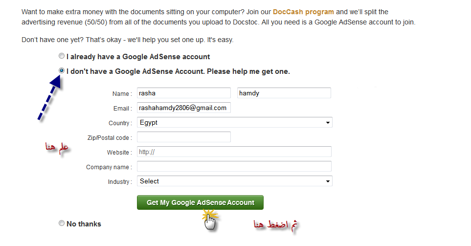 نقدم لكم لكم شرح انشاء حساب جوجل ادسنس adsense عادي وليس مستضاف بدون اي صعوبة عن طريق موقع docstoc الخاص برفع الملفات .